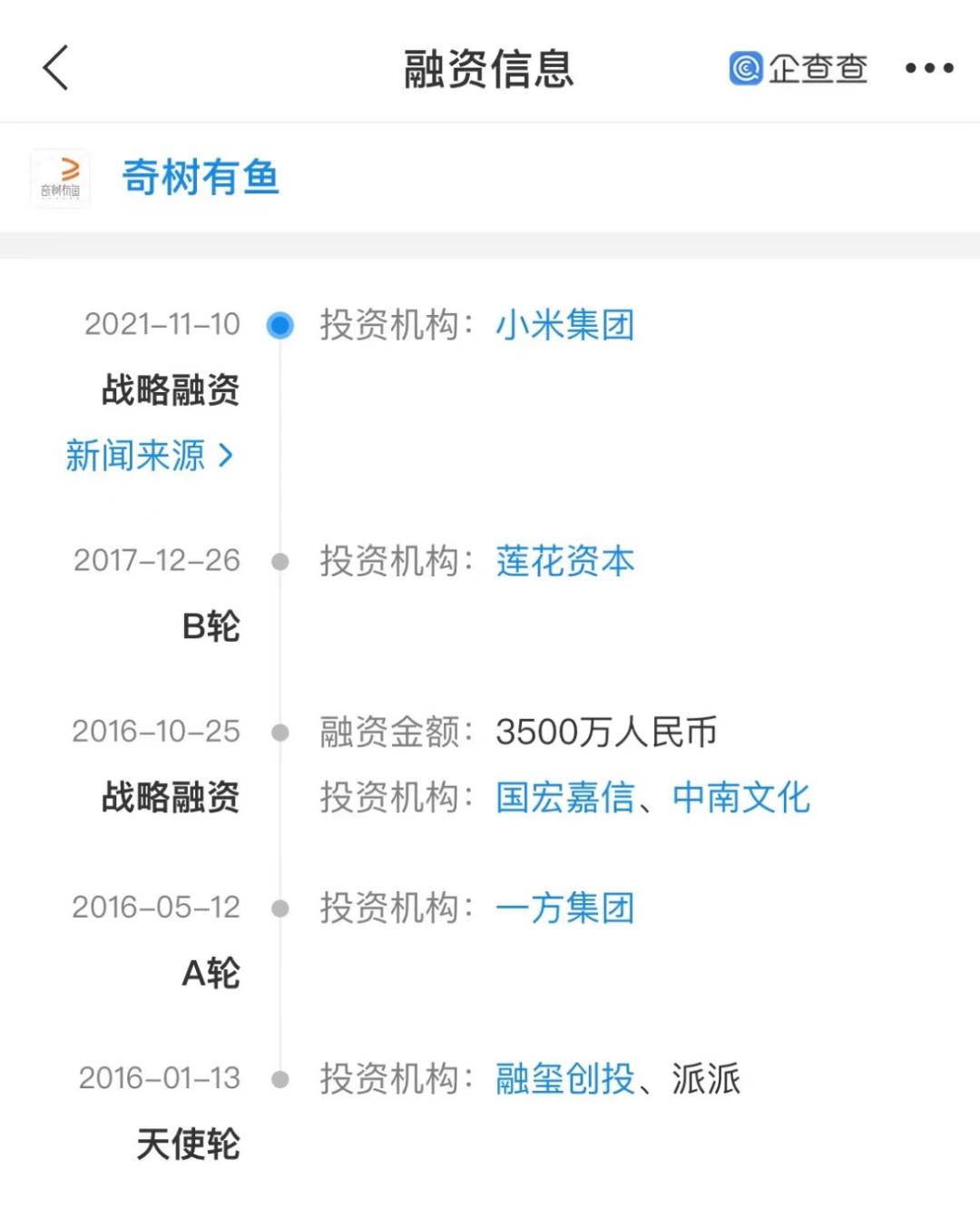 再往前,2021年11月,网络电影另一头部玩家——奇树有鱼也低调完成了战略融资,投资机构为小米集团。和淘梦一样,这也是奇树继2017年12月完成B轮融资(投资机构系莲花资本),四年后再续融资故事。