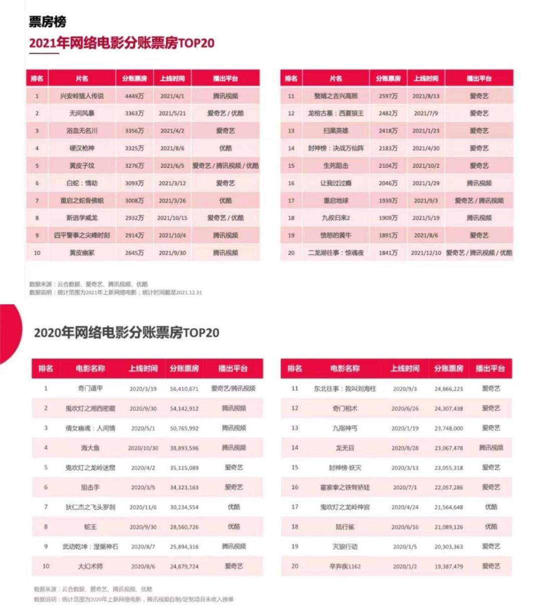 根据爱奇艺发布的《2021年网络电影行业年度报告》显示,2021年网络电影分账票房top20,最高分账系《兴安岭猎人传说》(4449万),top20《黄皮幽冢》(2645万)。这个数字相较于2020年网络电影分账票房top20榜单来看,有所下降。彼时,《奇门遁甲》《鬼吹灯之湘西密藏》《倩女幽魂:人间情》票房均在5000万之上。