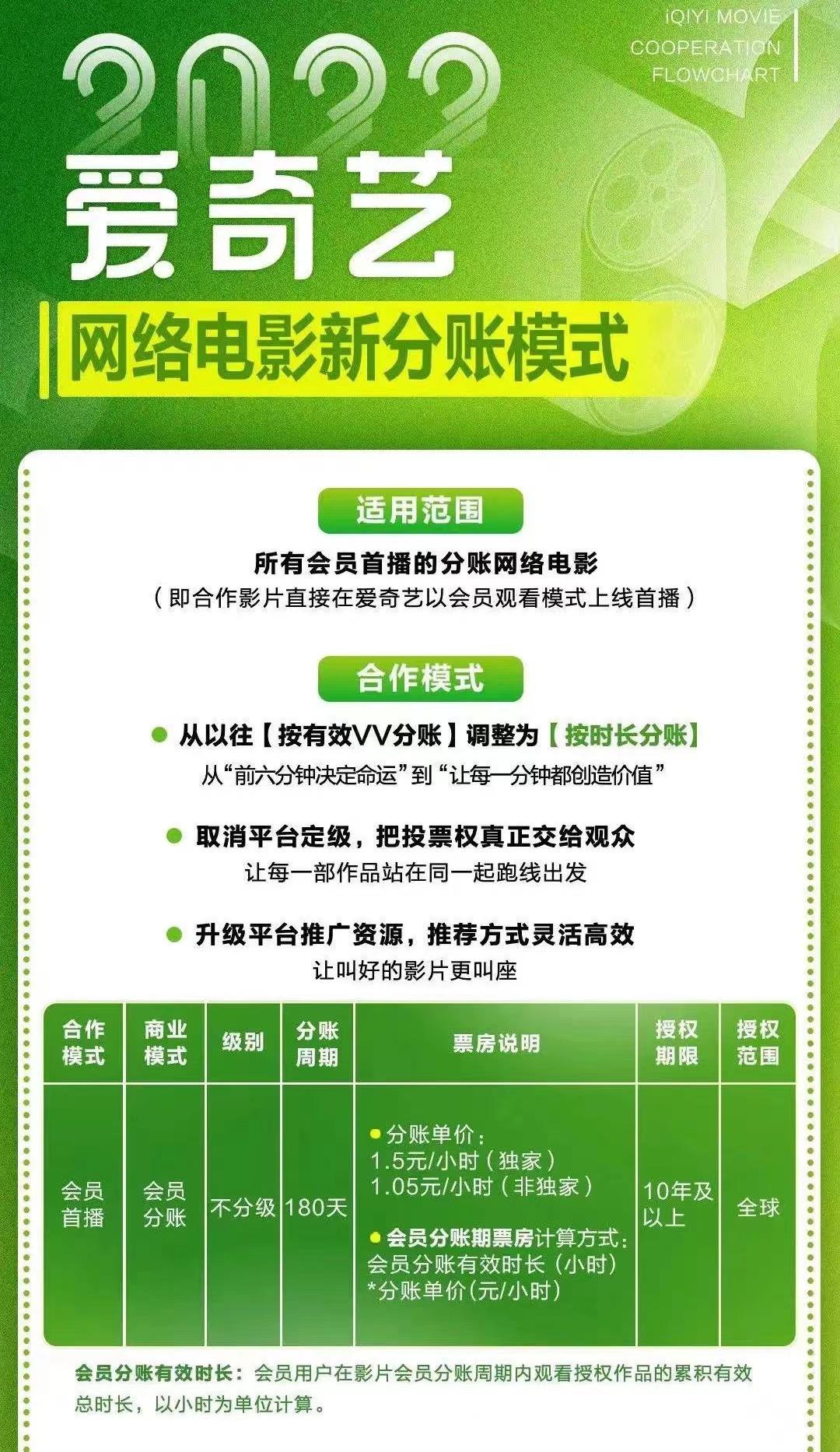 今天(3月3日)中午爱奇艺官宣网络电影再升级。化重点:自4月1日起,爱奇艺网络电影合作从以往“有效vv分账”调整成为“按时长分账”,寓意让每一分钟都创造价值;影片不再分级。分账单价分为:1.5元/小时(独家)、1.05元/小时(非独家)。会员分账票房计算方式:会员分账有效时长(小时)*分账单价(元/小时);同时,平台推广资源也作出相应调整,取消了原来以定级为基础匹配的推广资源,改为根据播放表现(具体指播放时长、转化率、评分等)来匹配推广资源 。
