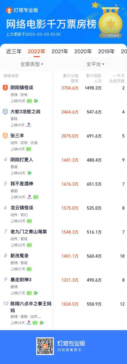时间来到2022年。根据灯塔数据显示,截止发稿,今年累计有10部网络电影分账突破1000万,最高系《阴阳镇怪谈》(3702.8万),最近一部破千万的则是《陈翔六点半之拳王妈妈》(1022.1万)。