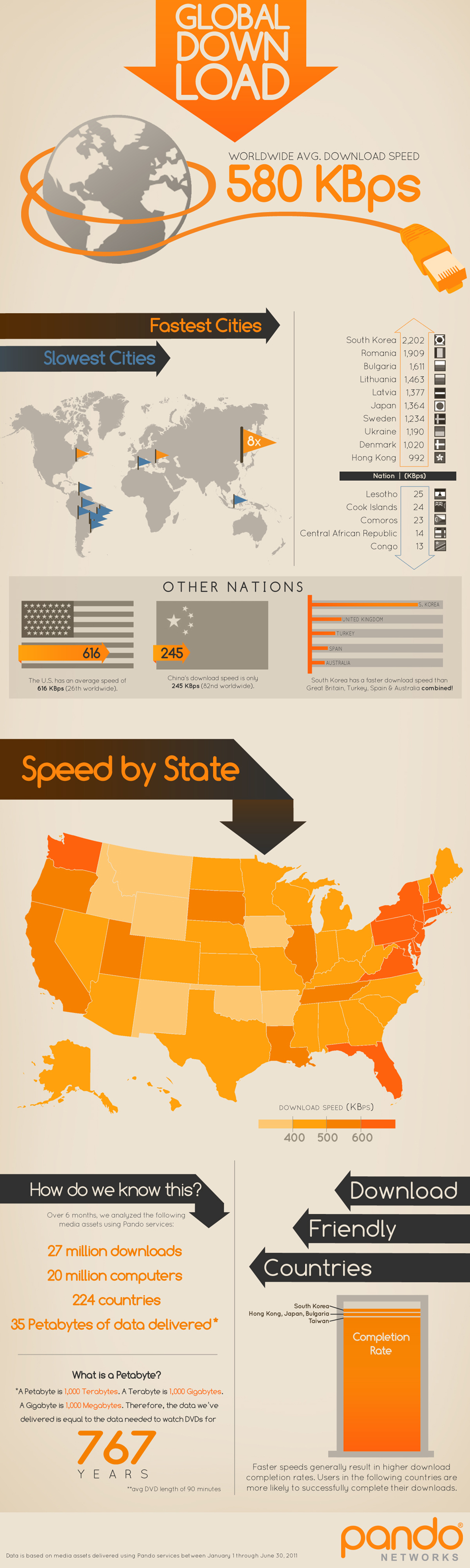 为了对世界各国的网速有一个全面的了解,美国网络数据传输公司Pando Networks最近发布了一项全球网速数据报告,报告显示,全球互联网平均下载速度为580KB/秒,韩国互联网下载速度位居全球之首,平均下载速度为2202KB/秒,而美国互联网平均下载速度仅位列26位,平均下载速度为616KB/秒,这确实出乎很多人的意料。