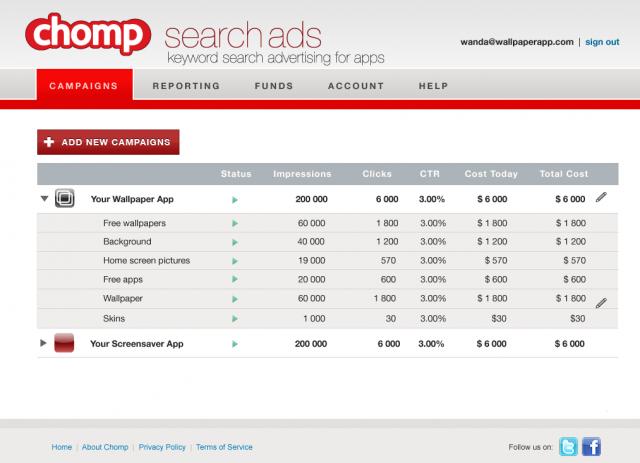就像Google的AdWords,Chomp的搜索广告是基于竞价的服务,开发者建立一个帐户并预先为帐户充值,开发者可以设定每天最高花费多少,每个关键词最高出价多少等。