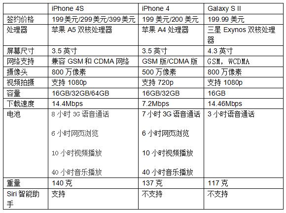 iPhone 4S、iPhone 4和三星Galsxy S II的参数对比
