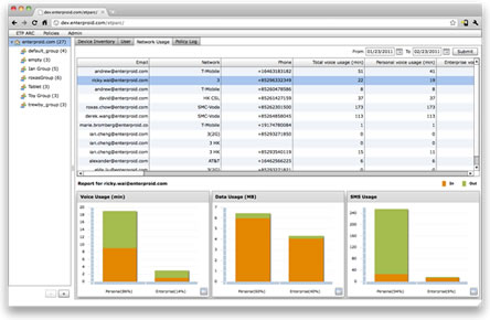 Enterproid为IT管理员提供了一个控制面板,支持部署、实施公司规章制度。管理员可以看到所有联网的手机,按组设定不同规定,还可以远程删除公司数据,锁定公司档案,重置密码等。里面的费用管理工具还可以发现漫游的手机,显示运营商数据使用情况。