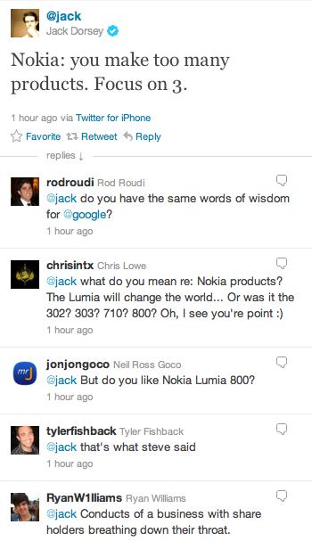 作为一个局外人,Twitter兼Square创始人Jack Dorsey给诺基亚开除了药方:你们做的产品太多了。专注于三款即可。 当然,是在Twitter上: