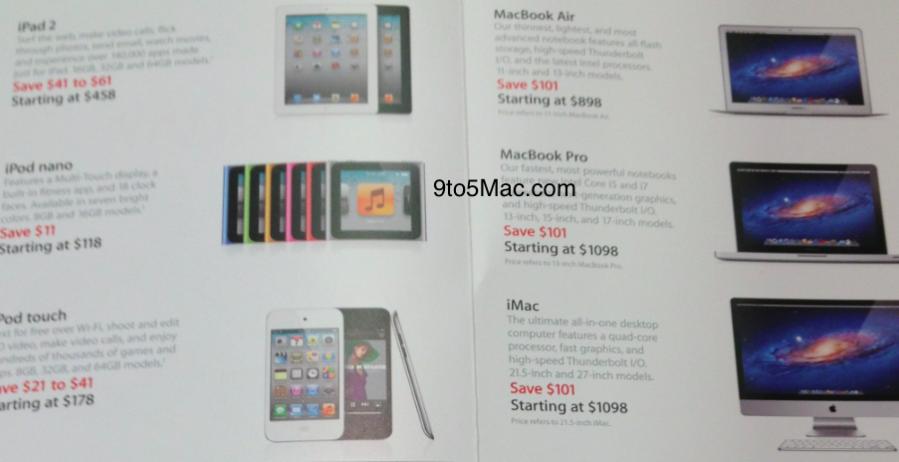 这本泄露出来的册子显示,iMac、MacBook Air和MacBook降价101美元,根据配置的不同,iPad的降价范围在41美元至61美元之间。iPod touch的降价范围在21美元至41美元之间,iPod nano降价11美元。很多其它的附近产品也都有小幅度的降价。
