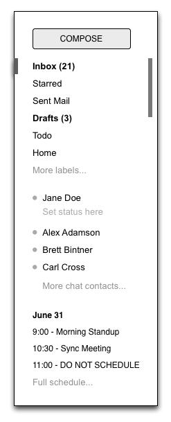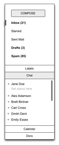 新版Gmail的目标之一是让它看起来更像是一个本地应用,左侧面板可以单独上下滚动,而不是一整个单独页面滚动。这种设计方式有很多优势:搜索框和主导航位置总是不变,收件箱未读邮件数总是可见等。就像做出任何设计决定一样,做这种改变有很多挑战,如果人们建立了很多标签,那么Gtalk联系人就会被向下推到页面之外,那些安装了Google文档或日历的用户,他们可能必须滚动侧边面板经过标签和联系人才能看到这些Gadget。