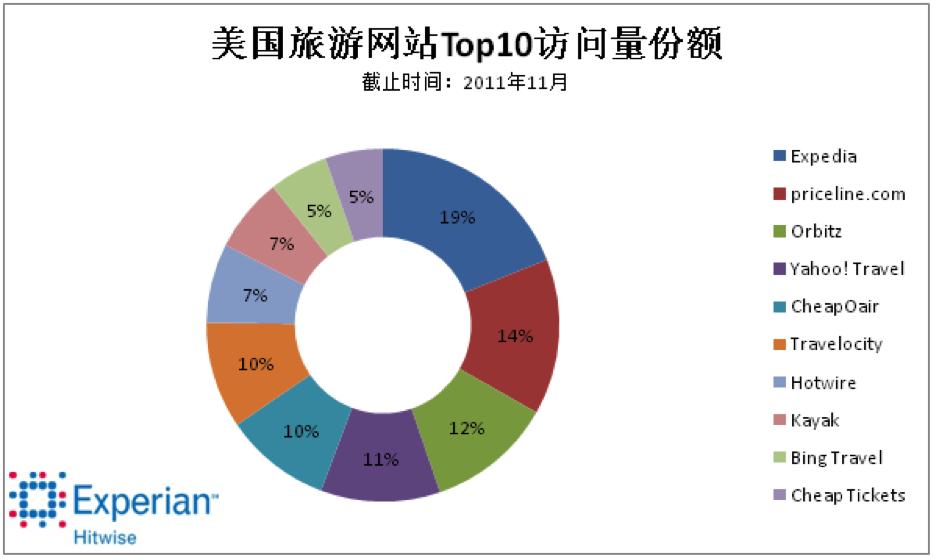 这也是中国在线旅游市场与美国不同的地方,美国排名前6的旅游网站占了行业访问量的63%,并且这6家所占份额基本差不多,Expedia以比较小的优势占据第一。但是Expedia的资产更多,除了美国Hotwire等品牌,在中国Expedia还拥有酷讯、到到网、易达并控股艺龙等旅游网站。