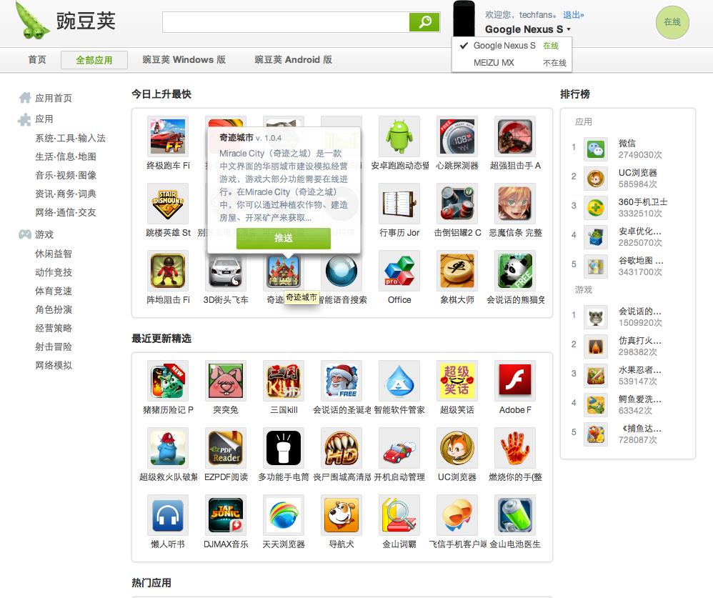 手机端都通过豌豆荚账户登陆后,在网页版中看到、搜索任何应用,只需要点击“推送”按钮,用户的手机就会自动下载这款应用了(如文章底部图片所示)。另外,豌豆荚网页版支持多设备的推送,正如我在上图中使用的一样(Nexus S 及 魅族 MX)。
