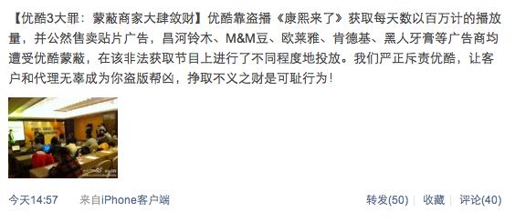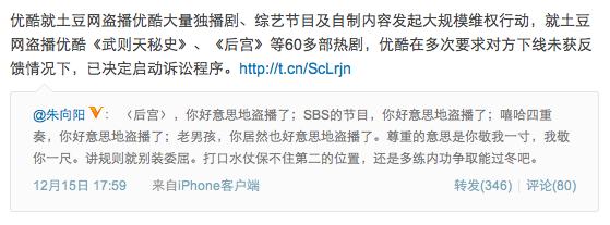 2.微博开战。土豆网将微博作为其维权主战场,连续发了多条证据和维权微博。包括历数优酷3大罪:铁证如山拒不悔改;蒙蔽商家大肆敛财;混淆视听劣迹斑斑。而优酷网方面也利用微博进行了回应,只不过不如土豆网激烈。我们可以预计由于微博的实时性,将来的公司斗争将更多的利用微博展开。