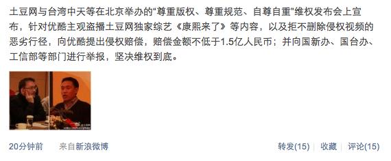 @优酷网 盗版其独家版权节目《康熙来了》,并索赔1.5亿元。