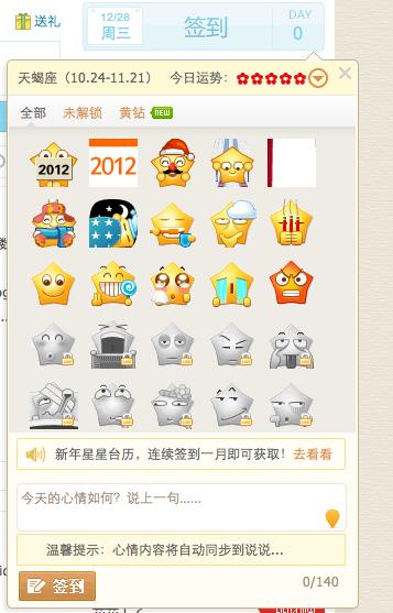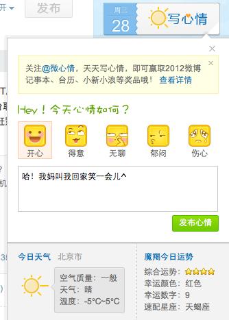 一大早晨起来就看到新浪微博网页版侧边栏多了个“写心情”的令牌,第一反应这不是QQ空间的右侧边栏的签到功能么?