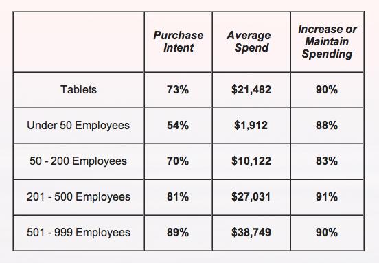 iPad的巨大成功,甚至让现在哪怕再小的企业也在考虑购买平板,雇员少于50名的小企业中有54%考虑购买,而雇员少于1000名的企业中则有73%考虑购买。平均来看,接受调查的小企业计划在2012年花费约21000美元购买平板,这个预算因企业的大小不同而有不小的出入。