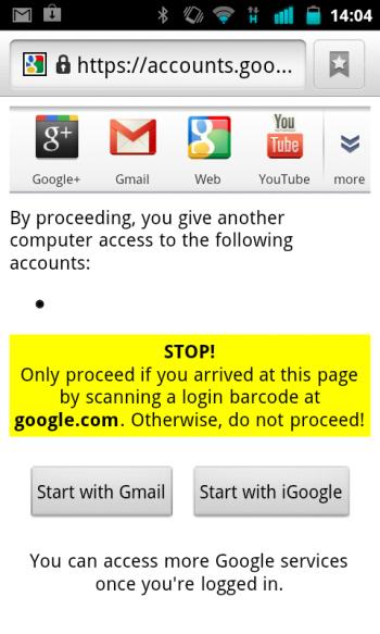 3.完成以后,会出现一个警告页面,提醒你仅在使用二维码登陆办法后才可以继续(有“登陆Gmail”和“登陆iGoogle”两个选项)。