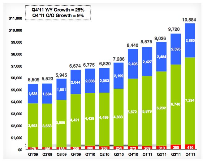 财报,Google每股收益9.5美元,净收益81.3亿美元。这一表现低于按照非公认会计准则(non-GAAP)计算,每股收益10.49美元,84亿美元的净收益的华尔街先前预期。此外,Google的股票在周四收盘后交易时下跌了10%。当然,财报中也披露一些好消息。截止2011年12月31日,Google第四季度营收105.8亿美元,同比增长25%,这也是Google单季营收首次超过100亿美元。净利方面,第四季度表现为27.1亿美元。同比增长6.7%。另外,Google还公布了一个振奋人心的消息,