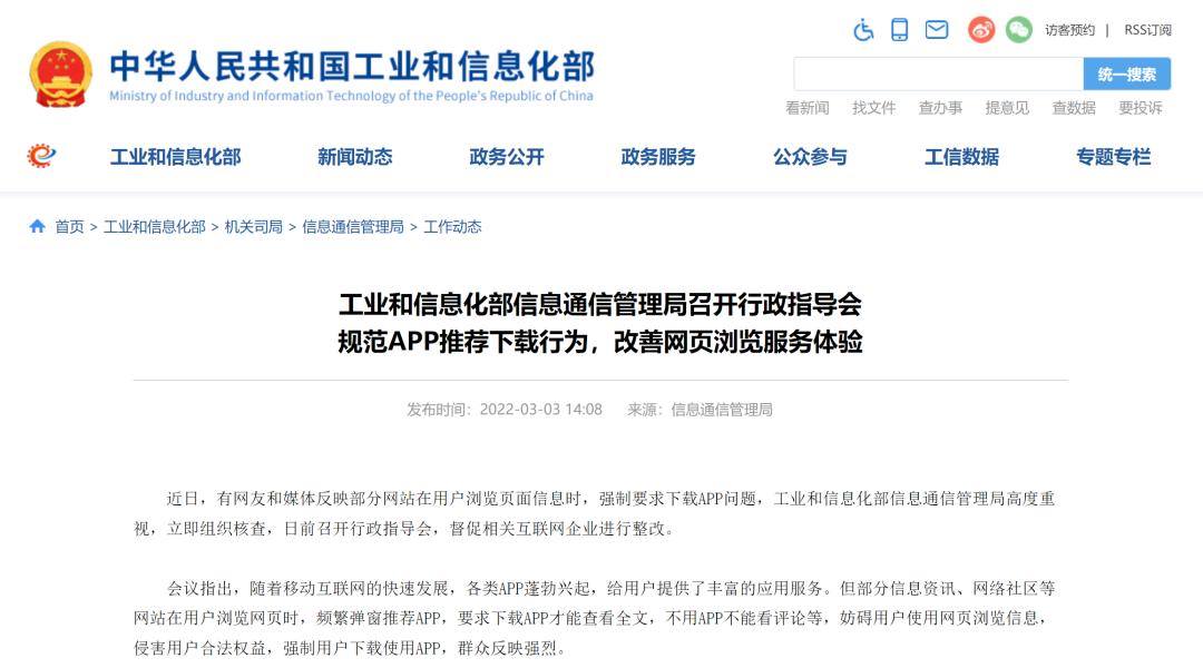 36氪获悉,近日,工信部信息通信管理局召开行政指导会。会议要求,在用户浏览页面内容时,一是未经用户同意或主动选择,不得自动或强制下载App;推荐下载App时,应同步提供明显的“取消”选项,切实保障用户的知情权、选择权。二是无合理正当理由,不得要求用户不下载App就不给看,或者不让看全文。三是不得以折叠显示、主动弹窗、频繁提示、降低体验等方式强迫、误导用户下载、打开App,或跳转至应用商店,影响用户正常浏览信息。