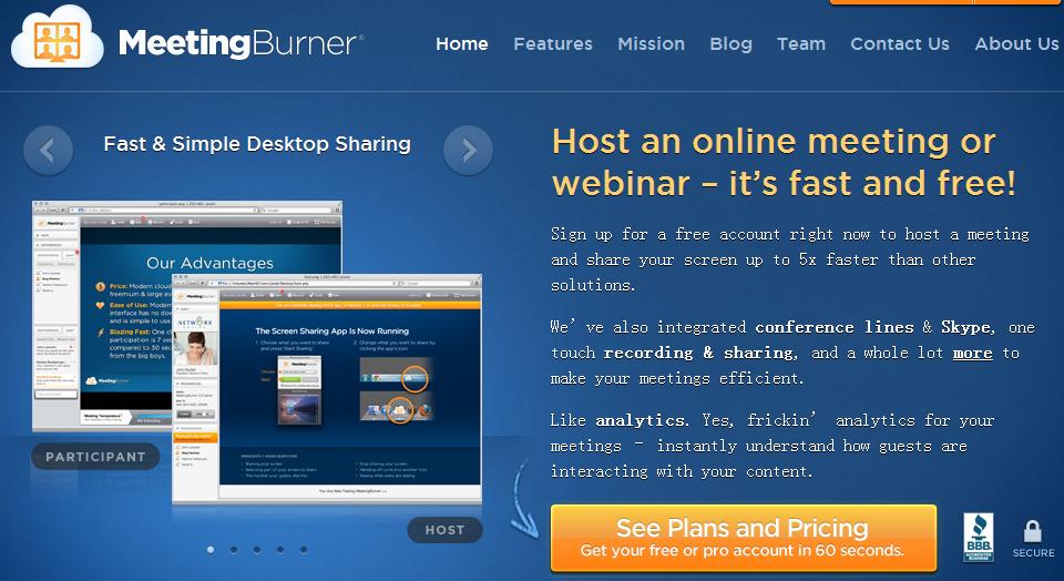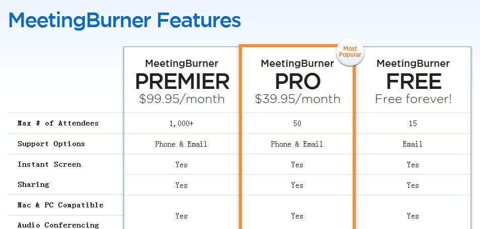 目前MeetingBurner有三种付费方式,免费版、专业版和高级版。其中免费版允许最多15人参加;专业版每月需支付39.95美元,支持50个人参加会议、电话接入、会议录像和更高的安全性;高级版每月需99.95美元,会议最多支持1000个人参加,另外还整合PayPal功能、会议分析功能等。