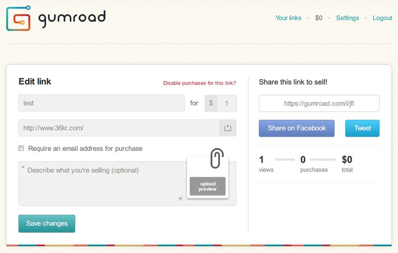整个付费链接的制作过程非常友好,登录之后预先设置好你的 PayPal 帐号,附上你的链接地址和为此开出的出售金额;如果需要的话还可以加上一些注释,一键分享到 Facebook 或 Twitter ,然后就可以坐等收入了。Gumroad 对链接的类型并没有限制,那么什么链接是值得购买的呢?新鲜出炉的网站或应用的邀请注册链接,还是一份专业研究报告?