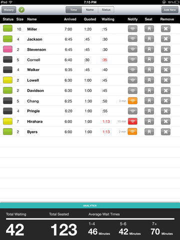 登陆AppStore。NoshList提供座席安排、等待时间预估、通知消息推送等多项功能,覆盖了一张就餐订单从生成到处理完毕的全部过程。NoshList操作界面的设计十分直观明晰,用列表的形式排列所有的订单,并标注了每张订单的开始时间和等待处理时间。列表每行的开头有一个颜色标记,用以表示订单的处理状态,便于餐厅随时把握进展情况。