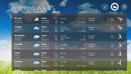 这是一个位于华盛顿的团队建立的天气预报方面的APP。干净整洁的用户界面、云数据接入以及让开发者简易上手的开发平台,促使Andrei Pushkin 和 Dima Suponau(开发者)迅速的开始开发这款Metrol风格天气预报APP。这是他们的第一款Metro风格APP,他们说将继续推出更多的作品。他们对后续的开发者们的建议:“赶紧开始你的开发工作,该平台已经非常稳定并且可用性很强,很快会有大量的人们使用Windows 8,对APP的需求将非常剧烈。”通过你的指尖,你就可以非常享受获取全球各地准确可靠的天气信息。对于功能,我想我们完全不用担心,我们最想看的还是其体验效果。