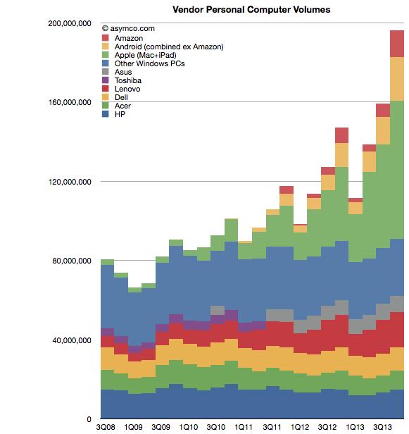 有以上的前提假设,下面是Dediu的分析数据。Windows、Mac、iPad、Android和Amazon自2009年第三季度到2013年第三季度的年增长速率预测。