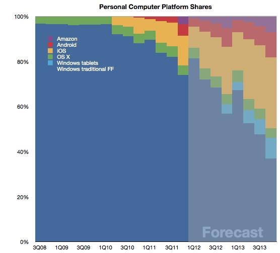 下面这张是各个类型产品的市场份额趋势预测。其中到2013年第二季度,Amazon、Android和iOS设备就超过了OS X和Windows 设备,而且还是在Windows中有部分平板份额的情况下。(FF = form factor)