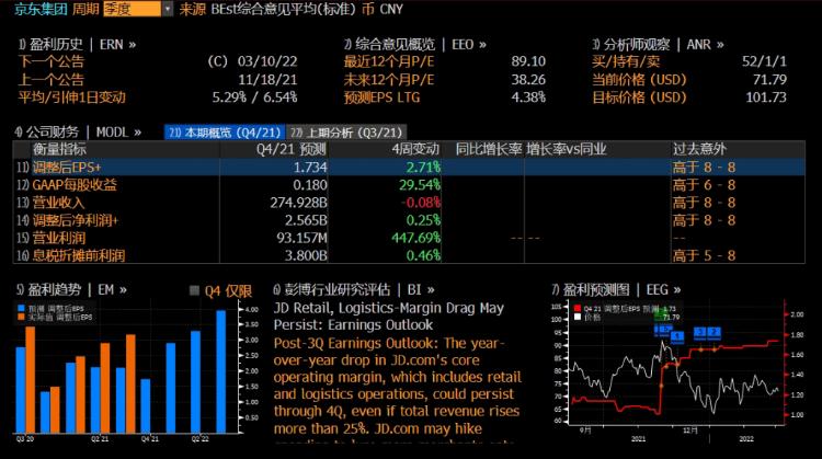 据彭博分析师预计,2021年Q4京东营收为2749.28亿元(人民币,下同),较去年同期实际营收2243亿元增长约22.6%;预计调整后净利润为25.65亿元、每股收益为1.734元。