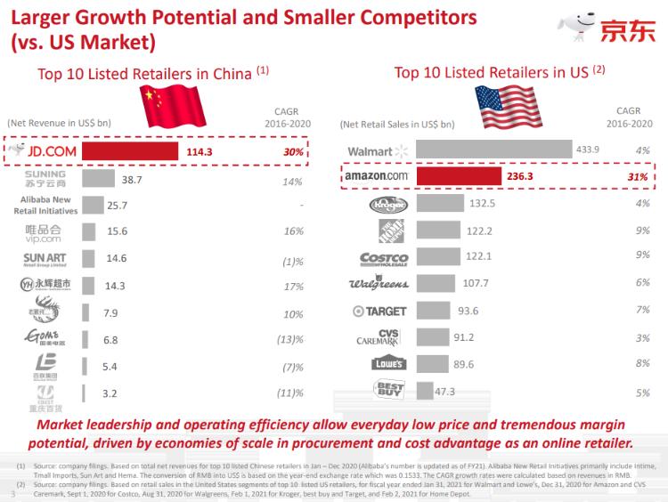 中美零售商营收情况对比 来源:京东Q3财报