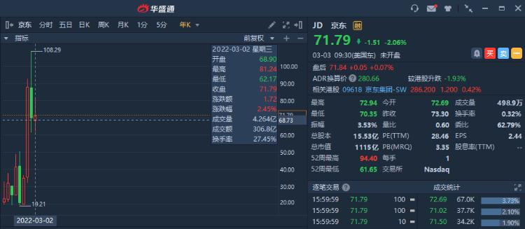股价方面,与同为电商概念股的阿里、拼多多相比,京东的股价表现要稳定一些。在中概股普遍低迷的大环境下,京东 $JD 去年仅下跌约20%,今年则录得2.45%的涨幅。而阿里 $BABA 和拼多多 $PDD 去年分别跌约50%和70%,今年目前均跌超10%。