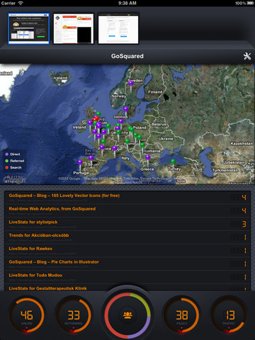 提供网站实时访问状况监测的服务很多,像<a href="http://chartbeat.com/" target="_blank">ChartBeat</a>、<a href="http://getclicky.com/" target="_blank">Clicky</a>、<a href="http://www.gosquared.com/" target="_blank">GoSquared</a>以及<a href="http://www.google.com/analytics" target="_blank">Google Analytics</a>等都可以。但这些服务都需在浏览器中使用,还没看到多少在这方面做得较出色的移动应用。直到<a href="http://www.gosquared.com/ipad/" target="_blank">LiveStats </a>for iPad的出现,才有了一个华丽且非常实用的移动网站监测工具。