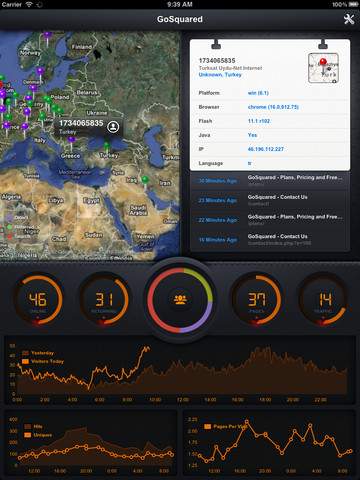 每位到访者都会被标注在同一张世界地图上,可以通过缩放屏幕来查看细节。敲击任何一个标注,都可以看到诸如IP、所用操作系统、设备以及浏览器之类的各种详细信息。同时LiveStats也支持访问GoSquared用户数据库,所以如果你已经导入数据库,那么在用户登陆你的网站时就可以对其进行识别。