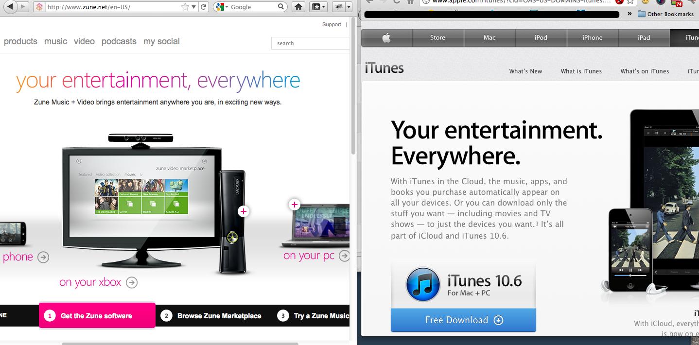 Zune主页的“your entertainment, everywhere”广告语是如此相似 (参考翻译:无处不娱乐) —— 一样的单词,不一样的标点和大小写,苹果这次算是赤裸裸的抄袭吗?或是有另外的考虑?