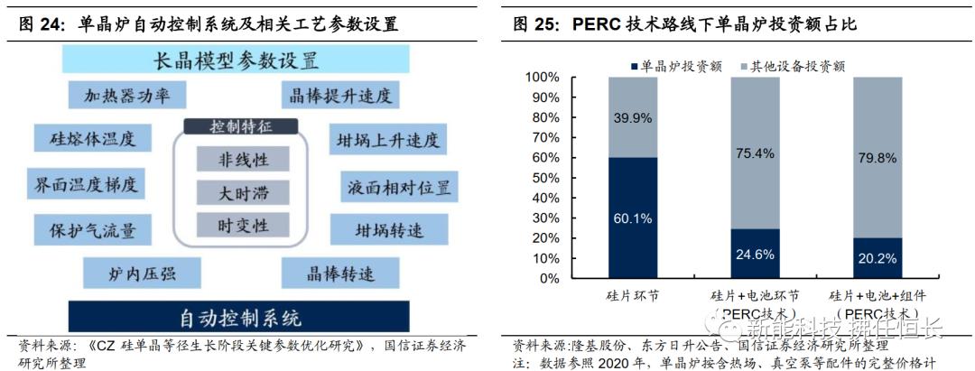 综合来看,单晶炉因技术较高在设备中的价值占比也较大,在已相当成熟的PERC 电池技术路线下,单晶炉是从硅片到组件环节投资额最高的单项设备,占硅片环节的 60%,所有设备的 20%。