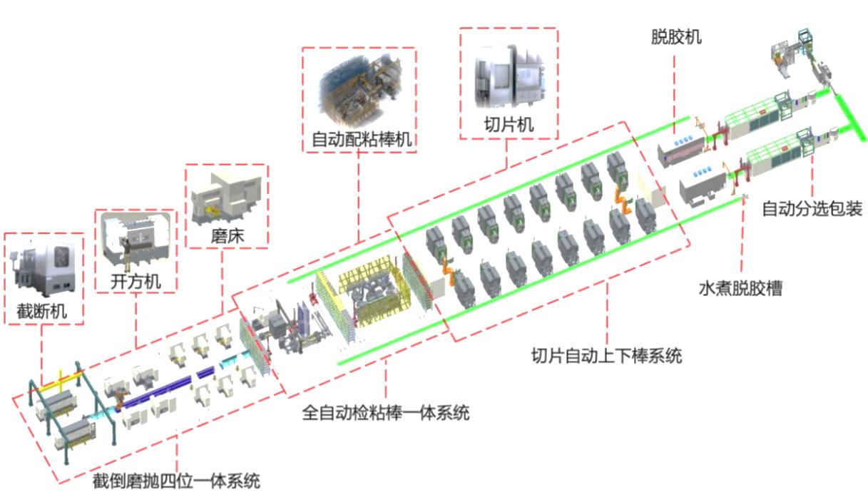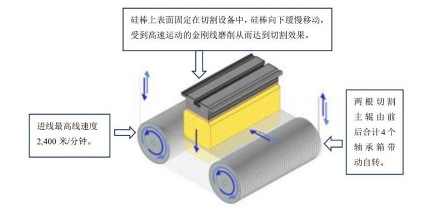 金刚线切割技术主要由金刚线切割设备和切割耗材(金刚石线、金刚石微粉)组成。金刚石线是在表面上固定有金刚石微粉颗粒的钢线,利用高速运动的金刚线在物体上不断往复磨削,就可以达到切割高硬脆材料的目的。金刚石线越细、金刚石微粉越小、切割速度越快,切割硅料损耗也就越小,出片率和切割效率就越高。