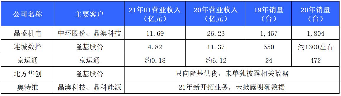 由于不同硅片厂商使用的单晶炉工艺参数为核心机密,更换供应商后调整参数的试错成本较高,因此目前单晶炉生产企业与硅片厂商一般处于高度绑定的状态,市场参与者较少。除连城数控外,目前行业内单晶炉制造商主要包括晶盛机电、北方华创、京运通以及奥特维。