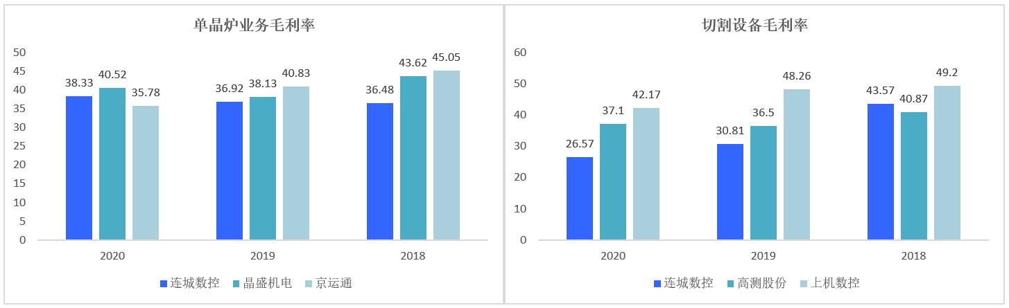 在享受隆基市场份额提升为公司带来的营收规模扩张时,经营业绩方面连城数控也为隆基作出了应有的牺牲。从毛利率来看,虽然连城在单晶炉及切割设备等核心业务布局较早,但是毛利率却低于同业。