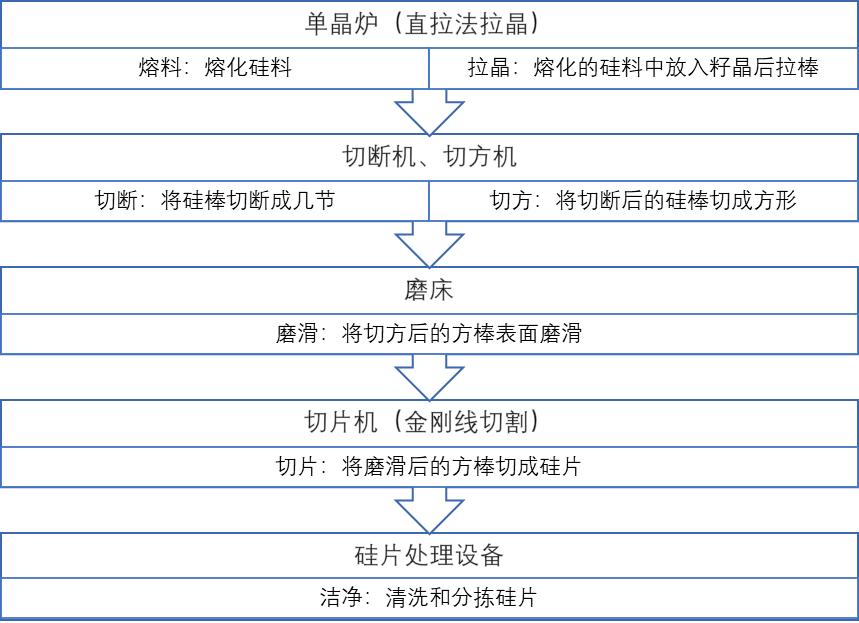 工艺方面,目前直拉法(CZ法)为生产单晶硅片的主流工艺,利用直拉法生产硅棒的设备就是单晶炉。直拉法制作单晶硅棒的基本方式如下:利用高温在坩埚中将硅料熔化,再将一小块籽晶浸入硅熔体中,随后边旋转边缓慢向上提拉,部分硅熔液就会随籽晶离开液面, 按照单一晶向凝固,持续不断的生长出圆柱形的棒状硅晶体。