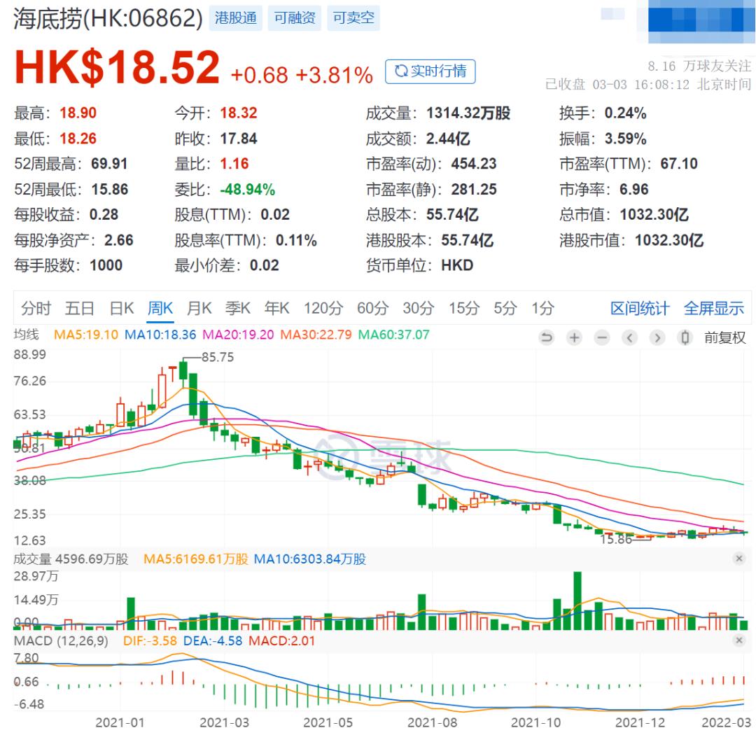 海底捞的急速扩张与猛踩刹车,导致股价也坐过山车从2021年初创造历史新高的85.8港元/股后,就开始一路震荡走跌至今,徘徊在18港元/股的位置,股价跌去近8成。