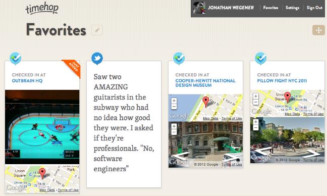 现在Pinterest火了,其瀑布流的展现方式很受人们欢迎。因此Timehop也不失时机的为用户新增了一项类似的功能。那就是用户可以在收到的邮件里“最喜欢”某一些照片或者文字,随后便可以在Timehop的网站上看到由自己“最喜欢”的照片和文字组成的瀑布流显示了。目前用户只能拥有一个这样的瀑布流页面,并且还不能和好友分享,但是Timehop计划会在以后允许用户拥有多个页面并且能和好友分享自己的私人瀑布流。