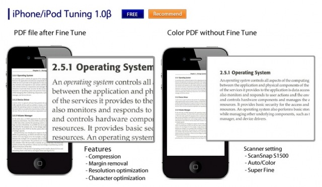 Fine Tune服务可以针对不同的设备对扫描出来的PDF文件进行微调、定制,以获得最佳的阅读效果。比如Fine Tune会针对iPhone去除多余的页边空白、压缩文件、优化分辨率和文字效果。