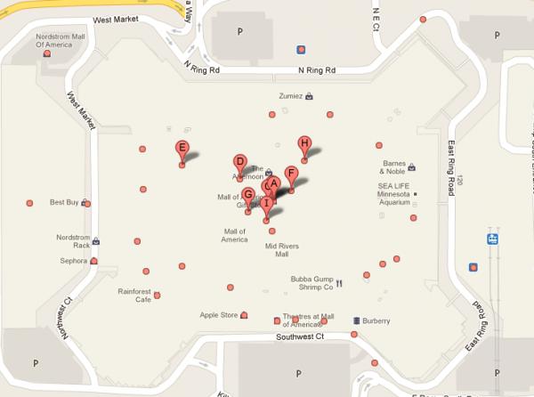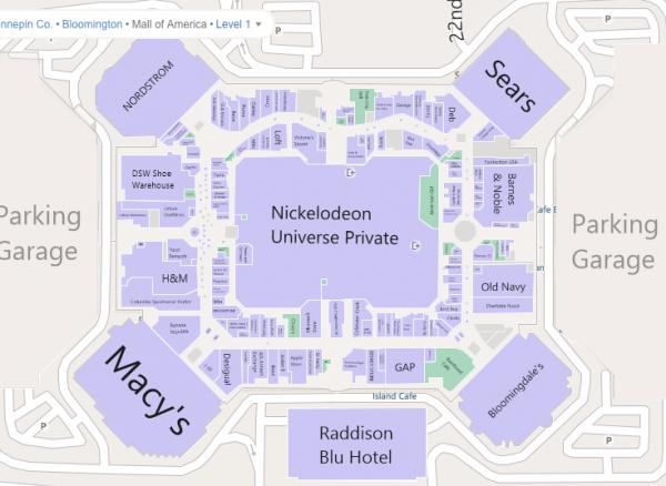 从下图可以看出,Bing Maps(上)对场馆地图的显示更加准确,而Google Maps(下)显示的比较简单。Bing Maps将商场里每家商铺的名称、大小和具体形状都清晰的展示出来,让用户很容易根据现场的环境来识别自己所处的位置。