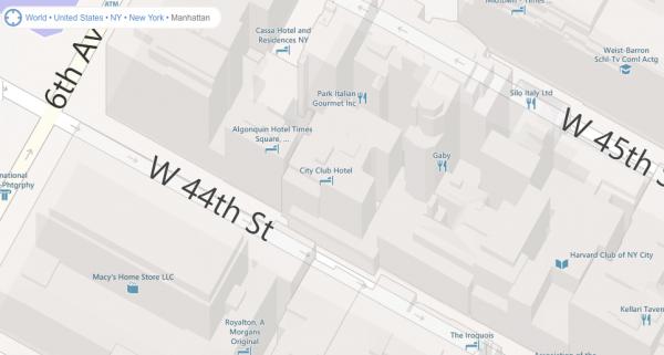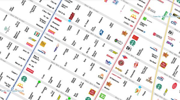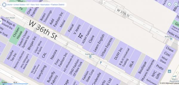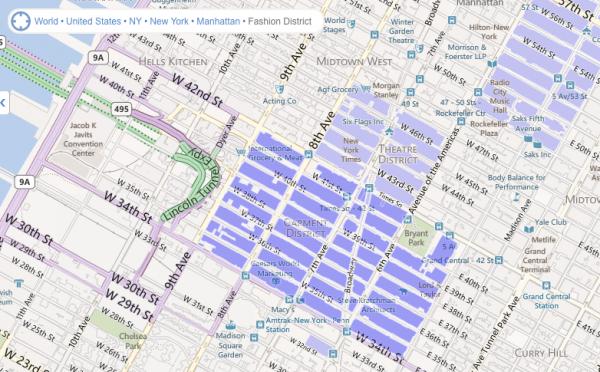 下图是纽约时代广场附近的城市地图,该图中Bing Maps将所有带有室内地图的区域用蓝色标识出来。这样用户一眼就可以看出哪些地方有室内地图,并可以看到商家的名称。