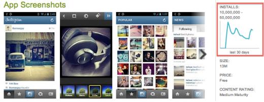 自手机拍照分享应用Instagram发布Android版本以来,得到了大量用户的欢迎。在登陆Google Play不到24小时,其下载量就突破了
