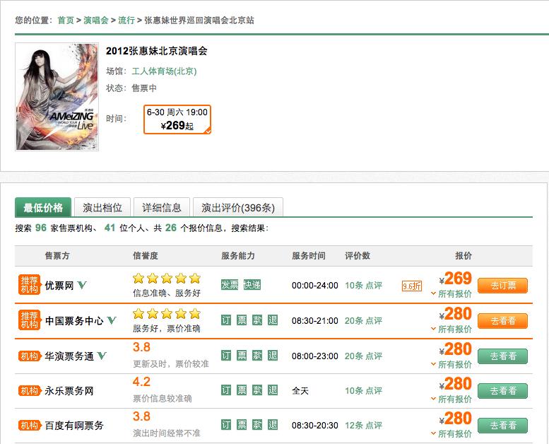 有戏网告诉我们,目前他们已经签约30多家B2C售票网站、50家左右个人售票供应商(以前没有签约),签约过的商家在搜索结果中会有一个绿色的V标志,就像新浪微博企业微博认证的V一样,只是颜色不同。