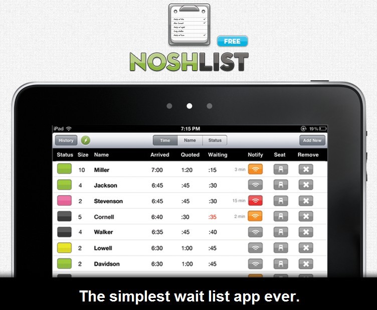 Noshlist提供坐席安排、等待时间预估、消息推送等多项功能。操作界面的设计清晰明了,用色彩的差异来标注订单的不同状态。Walker说,现在大约有800家餐厅在使用NoshList,有小夫妻店,也有大型的连锁店。他认为用户数增长速度如此之快的秘诀在于它的易用性:“技术障碍太低了,只需一个iPad和一个一看就会用的app,每个人都喜欢。”