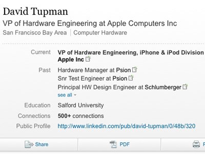 *苹果硬件工程副总裁David Tupman于去年年底离开苹果,目前不知在何处就职,Tupman之前一直负责iPhone和iPod的硬件工程部门