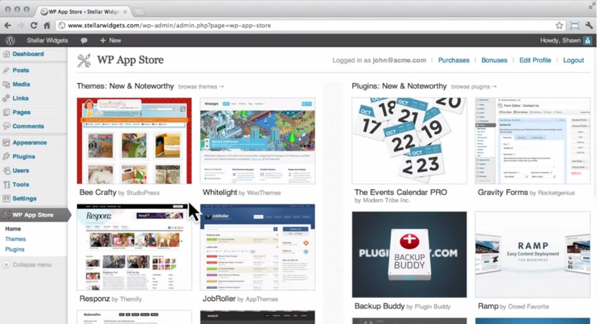 WP App Store。经过简单的安装操作后,用户便可以在后台的顶级菜单栏中看到商店选项。到目前为止,WP App Store已经与WordPress主题和插件领域最大的开发商与设计师合作发布产品,其中包括