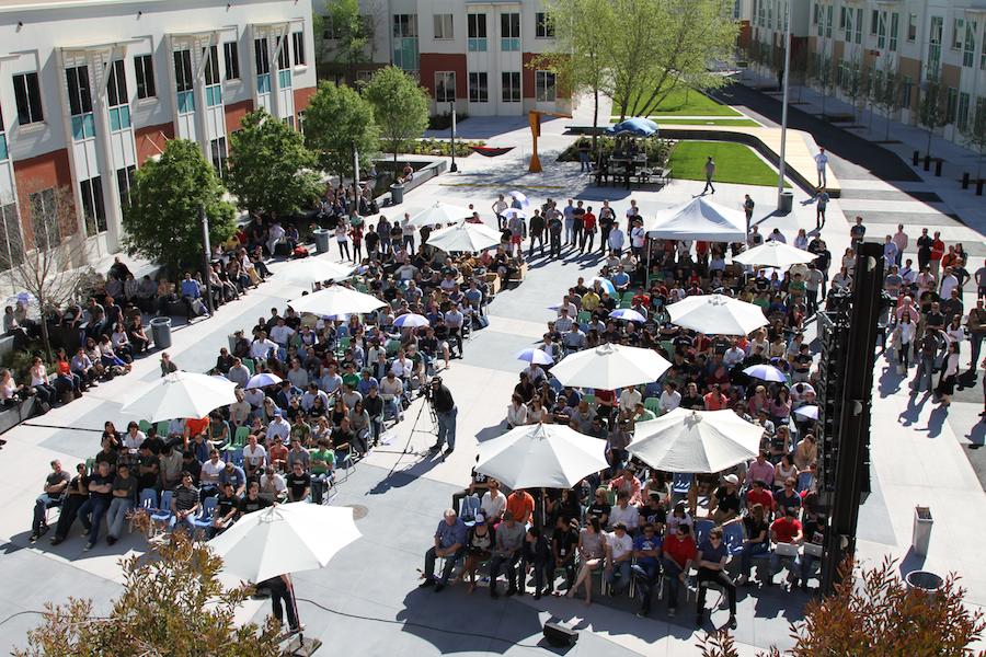 这里是Facebook的黑客广场(Hacker Square),每周五,员工将于扎克伯格在这里进行Q&A问答交流