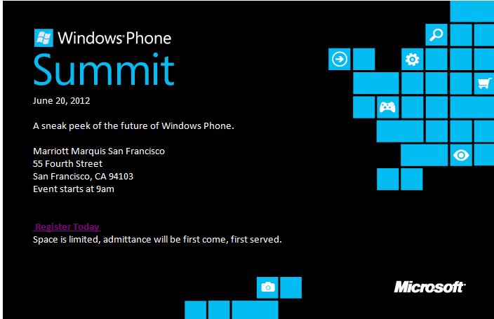 微软在上月初宣布将召开Windows Phone开发者峰会(Windows Phone Developer Summit),但没有透露计划详情。在刚刚向<a href="http://www.theverge.com/2012/6/4/3063346/microsoft-promises-sneak-peek-future-windows-phone-june-20th" target="_blank">媒体</a>发出的邀请函中,微软暗示Windows Phone 8可能会被提上议程。邀请函中表示将对“未来Windows Phone 先睹为快”,时间则是在6月20日。