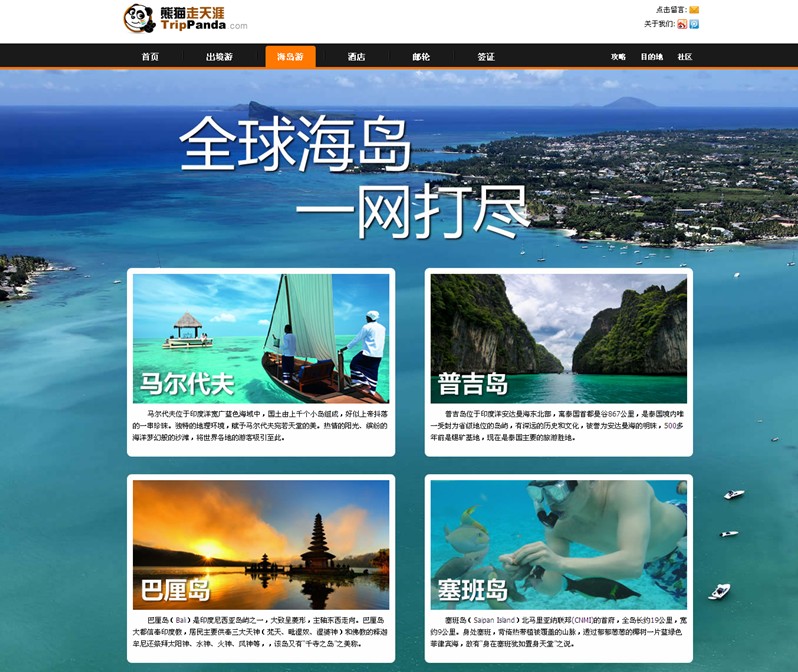新版网站突出了熊猫走天涯的两大主打产品——出境游和海岛游。和原来的界面相比,新版本更加简洁,进一步细分旅游市场。而子版块则是以图片为主导,为用户提供简洁的浏览页面和导航服务。另外网站还将上线呼叫中心,为用户提供电话咨询及预订服务。